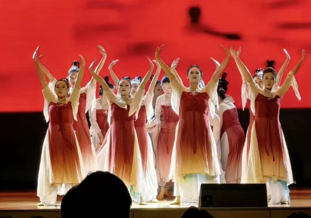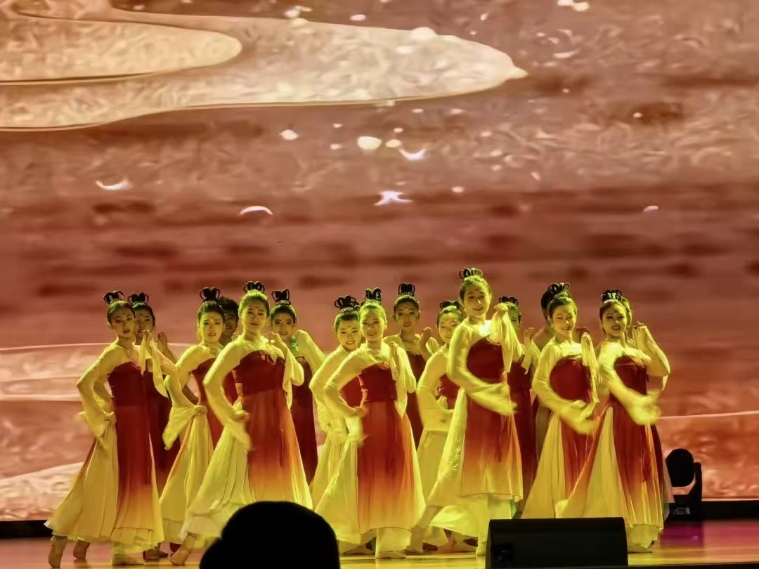 我院舞蹈节目《归家》以“文物”与“归心”为主题,通过细腻的肢体语言描绘了文物漂泊在外、历经风雨后回到祖国温暖怀抱的感人故事。作品巧妙融合民族舞的柔美与现代舞的力量,配合深沉的音乐、层次分明的队形变化和富有象征意义的道具,将“家”的温暖与力量传递给现场每一位观众。舞者们动作精准流畅,情感真挚饱满,每一次旋转与托举都饱含深情。尤其是结尾处,全体演员面向舞台后方缓缓走去,仿佛文物正在走向远方的家乡,引人共鸣,赢得阵阵掌声。