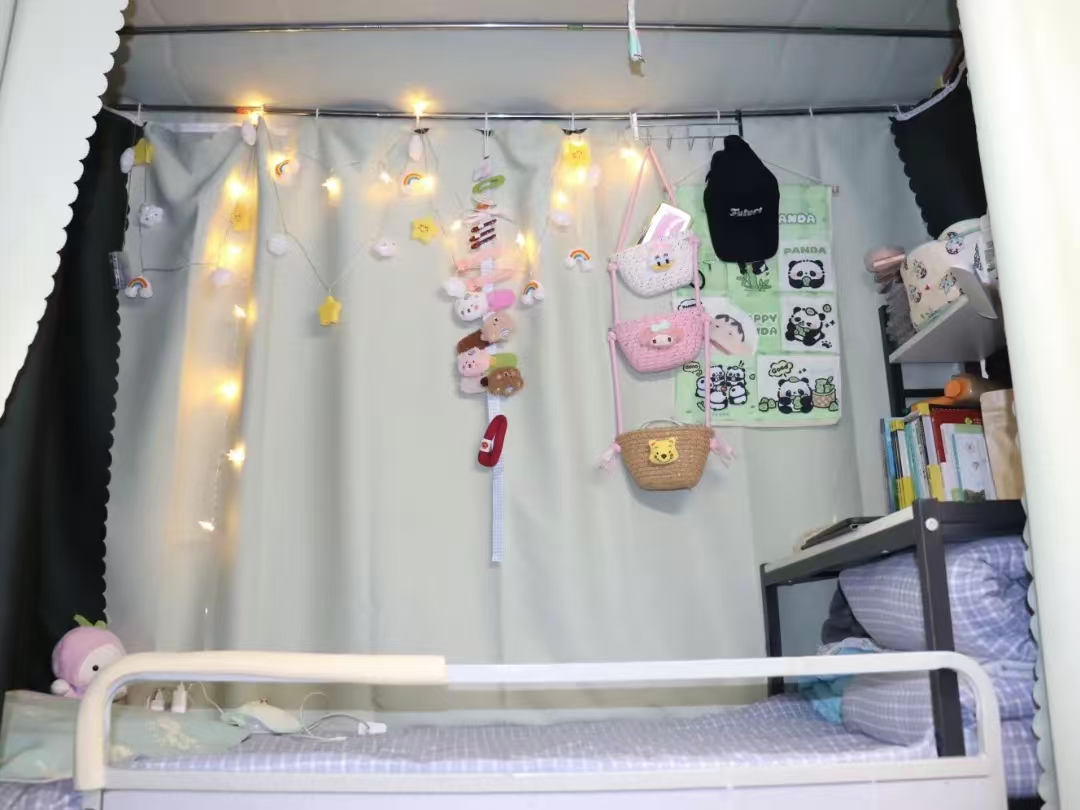 同学们高效地利用了有限的空间资源,精心打造出了风格独特的休憩区域。尽管书桌面积不大,但布置得井井有条且充满个性化元素,书籍与文具的排列整齐有序,台灯、绿植以及精致的花束作为点缀,不仅增添了实用性,更赋予了空间额外的审美价值。