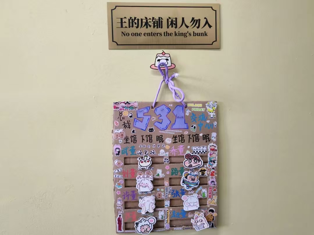 一扇朴素的木门上,“欢迎回家”四字洋溢着温馨的气息,顿时增强了家的归属感。手绘海报之侧,色彩缤纷的蝴蝶装饰板宛如振翅欲舞,彰显了食品学子们专业的风采与无穷的创意。这些巧夺天工的点缀,使得原本平淡无奇的宿舍角落焕发出勃勃生机与活力。