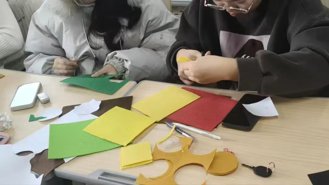 活动伊始,DIY创意社的社员向参与同学介绍了不织布手作的制作方法和文化内涵。现场清晰划分材料展示区与手工创作区,各色不织布、针线、胶水等物料整齐摆放。紧接着,社员现场演示裁剪、拼接技巧,细致讲解图案设计、色彩搭配、缝制手法的关键细节,点燃了同学们的创作兴致。最后,大家沉浸式专注制作,在针线穿梭间完成专属的钥匙扣、挂件等作品,真切体悟手作文化的温暖与巧思。